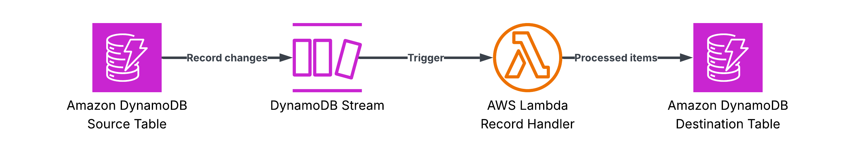 A Lambda function that handles INSERT/MODIFY/DELETE events on items of a source DynamoDB table by batch processing the records and upserting/deleting processed items into/from a destination DynamoDB table. Partial batch failure reporting is enabled so that individual record failures do not cause the entire batch to be retried.